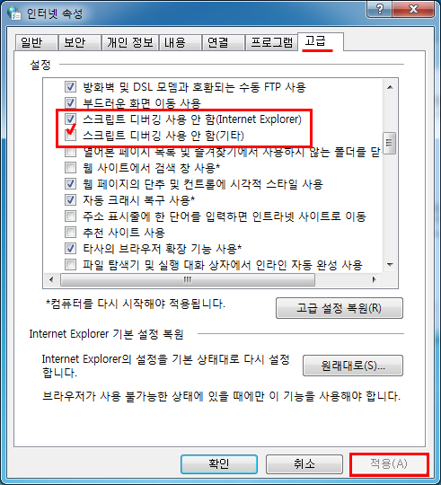 고급 탭으로 가서 디버깅 사용 안 함에 모두 체크한다.