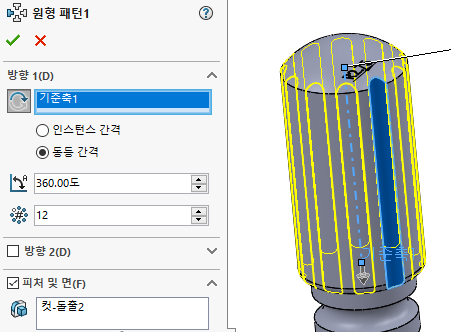 관통된 형상을 기준축을 중심으로 array 패턴화를 시켜준다.