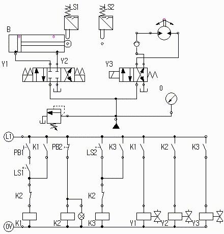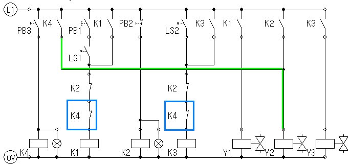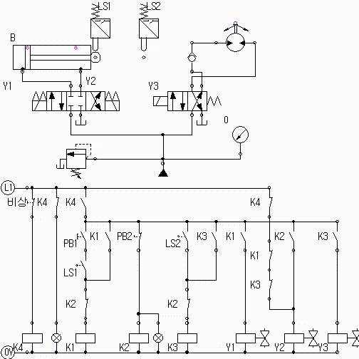 다시말해 PB3(비상)을 누르면 릴레이 K4가 여자되어 K4 b접점으로 실린더 A의 전진과 모터의 회전을 끊어준다.