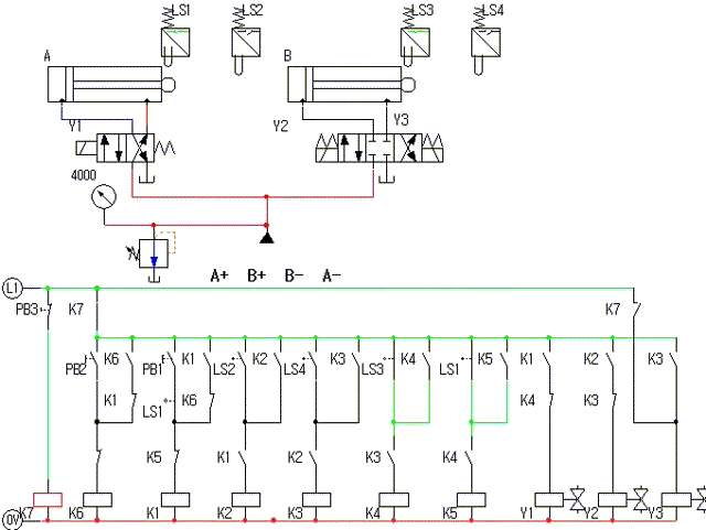 ① 후입력 우선회로를 구성하고 실린더 A가 전진 중에 스위치(PB2)를 누르면 실린더 A는 즉시 후진하고 실린더 B는 정지하여야 한다.
