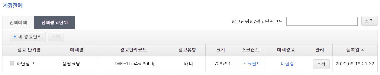 광고단위 목록을 클릭하면 아래와 같이 광고단위가 등록 되어 있는 것을 알 수 있다.