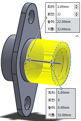 피치를 1mm, 반대방향으로 회전을 22회, 시작각도 180도로 한다.